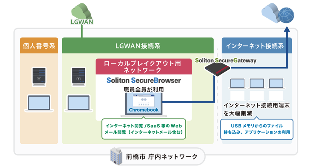 早くから検討されていたのが、ISMAPに登録されたクラウド以外のインターネットについても、Chromebook から安全に接続できるようにすることでした。自治体情報システムのネットワークでは、内部事務やマイナンバーを取り扱うネットワークと、インターネットを分離する必要があるため、職員の業務用端末とは別にインターネット接続用のWindows端末を利用してきました。しかし、各課に共有端末として2,3台しか設置されておらず、これが業務効率を大きく損なう要因となっていました。