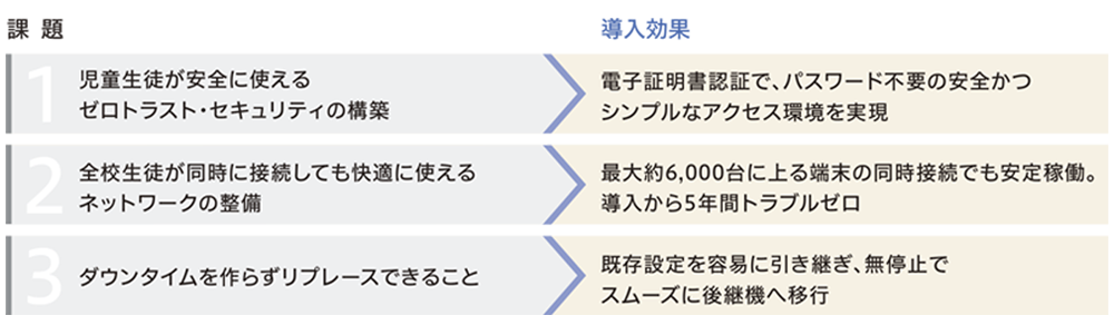「児童生徒の場合、パスワードなど人に依存するセキュリティでは、いつか必ずインシデントが発生するリスクがあります。しかし電子証明書であれば、本人は認証を意識することなく接続できます。また、来校者による不正な接続も防げます」
