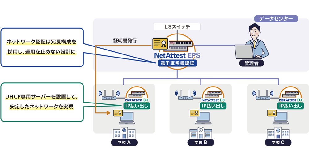 学習系ネットワークの中核を担うのは、電子証明書により強固なアクセス認証を実現する「NetAttest EPS」(以下、EPS)と、DHCP専用サーバーとして快適なネットワークを支える「NetAttest D3」(以下、D3)です。EPSはデータセンターに冗長構成で設置し、認証の安定性と耐久性を確保しました。また、D3も各校に冗長構成で設置することで、安定したIPアドレスの割り当てを可能にしました。このようにネットワーク基盤全体を冗長化することで、障害が発生しても影響を最小限に抑え、常に安定した学習環境を維持できる体制を整えています。