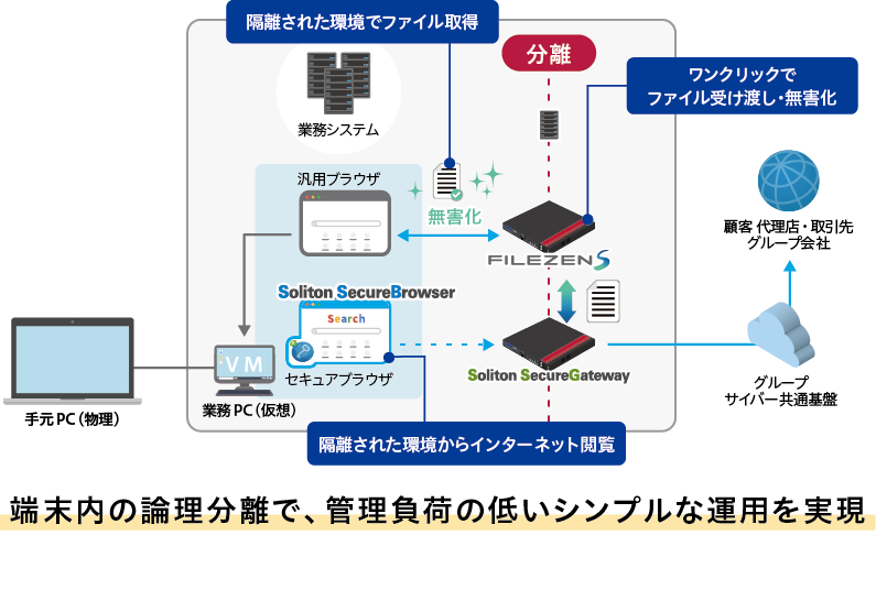 その中で採用されたのが、分離環境でのWeb利用を担うSoliton SecureBrowser(以下、SecureBrowser)と、分離環境とインターネット利用環境の間でファイルを受け渡すFileZen Sの組み合わせです。