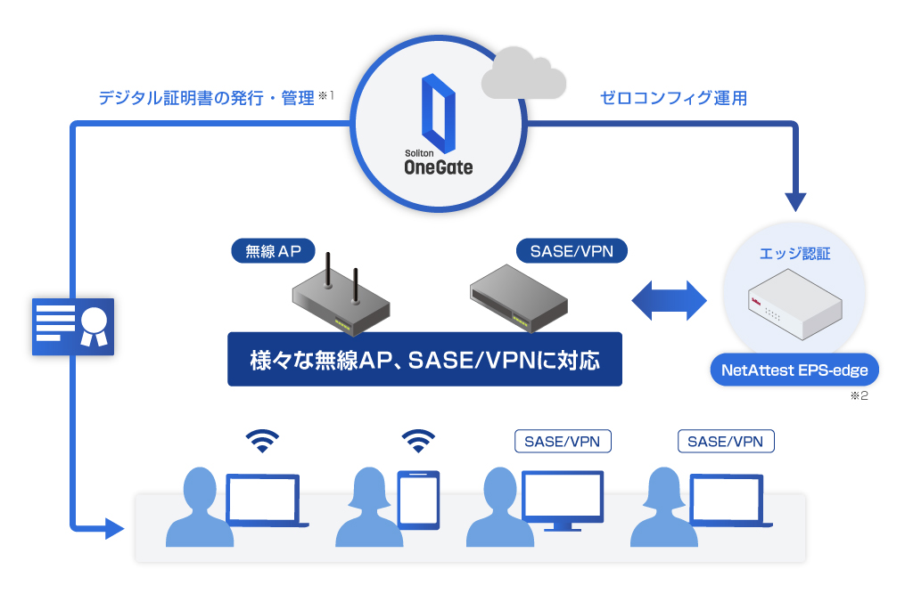 ※1 複数の証明書配布方式に対応しています。MDM連携での配布、専用アプリSoliton KeyManagerを用いた簡単・安全な証明書配布など、お客様の環境にあわせた柔軟な運用が可能です。