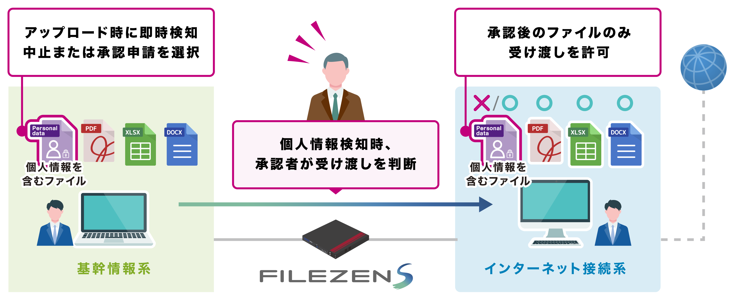 FileZen Sはこれまでも、ファイル受け渡しの承認フローや操作ログを提供してきました。今回、『個人情報検知』機能を追加することで、ファイルのアップロードから、検知、受け渡しの承認フロー、ログ管理までの一連のプロセスを、同一システム内で完結できるようになります。これにより、現場のオペレーションを標準化し、個人情報の見落としリスクを低減し、監査対応を効率化します。