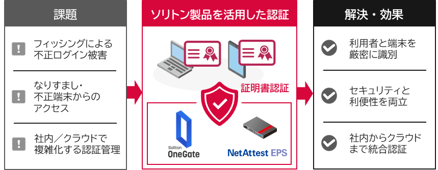 本ソリューションにおいて、ソリトンの認証システムにより、クライアント証明書を活用した強固な認証環境を実現します。採用にあたっては、ソリトンがこれまで培ってきた証明書認証システムの実績と信頼性が高く評価されました。